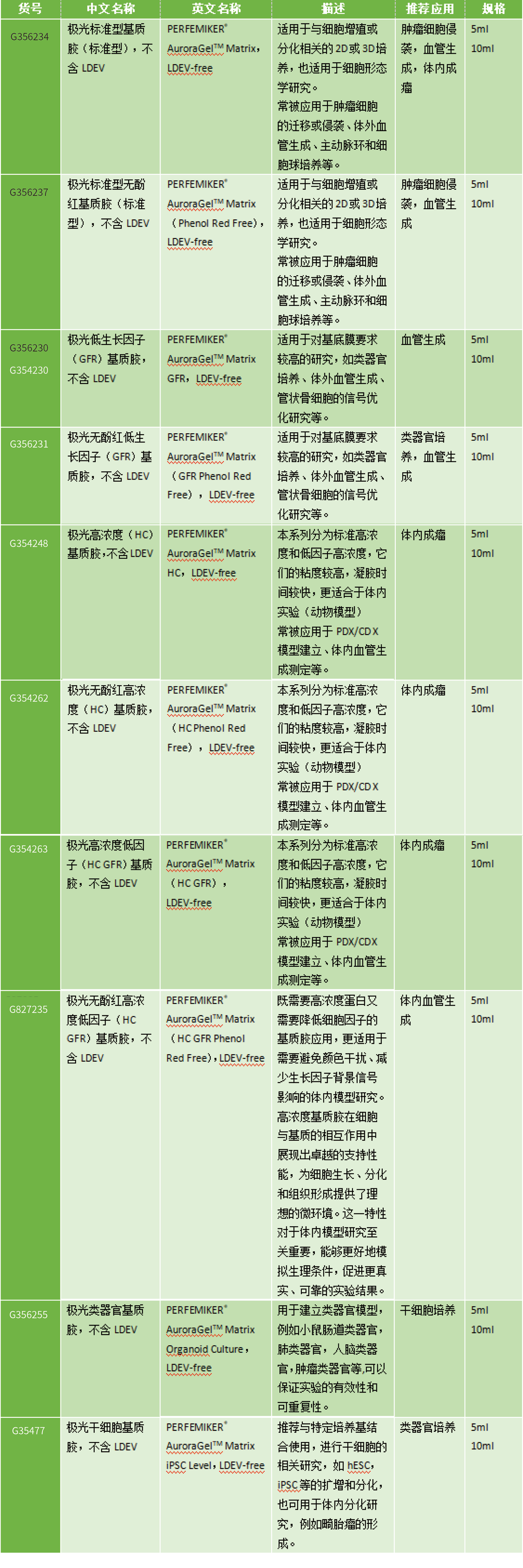 AuroraGel 系列基質(zhì)膠產(chǎn)品目錄: