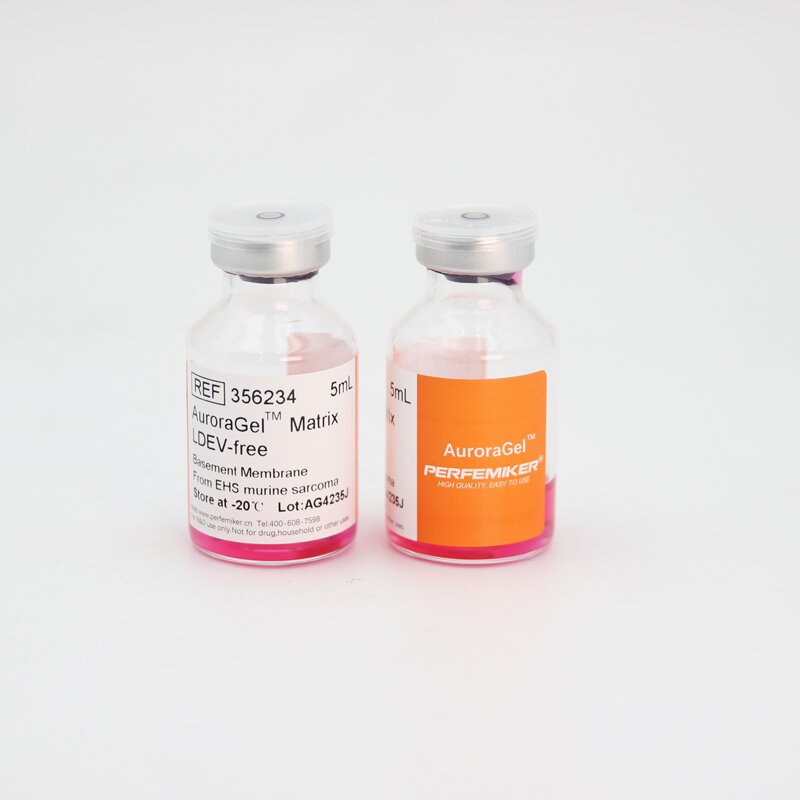 PERFEMIKER? AuroraGelTM Matrix是從富含胞外基質(zhì)蛋白的小鼠腫瘤中提取出的天然基底膜基質(zhì)。主要依次為層粘連蛋白(Laminin)、IV 型膠原蛋白(Col-IV)、巢蛋白(Entactin)、硫酸乙酰肝素蛋白多糖(Heparan sulphate proteoglycans)及多種細(xì)胞因子,如類胰島素生長(zhǎng)因子(IGF- 1)、轉(zhuǎn)化生長(zhǎng)因子β(TGF-β) 、血管內(nèi)皮生長(zhǎng)因子(VEGF)、表皮生長(zhǎng)因子(EGF)、成纖維細(xì)胞生長(zhǎng)因子(bFGF)等。產(chǎn)品溶解于高糖DMEM 中,且非定制產(chǎn)品均添加了50μg/mL 慶大霉素。適用于與細(xì)胞增殖或分化相關(guān)的2D或3D培養(yǎng),也適用于細(xì)胞形態(tài)學(xué)研究。 常被應(yīng)用于腫瘤細(xì)胞的遷移或侵襲、體外血管生成、主動(dòng)脈環(huán)和細(xì)胞球培養(yǎng)等。