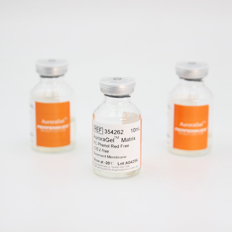 PERFEMIKER? AuroraGelTM Matrix(HC Phenol Red Free)是從富含胞外基質(zhì)蛋白的小鼠腫瘤中提取出的天然基底膜基質(zhì)。主要依次為層粘連蛋白(Laminin)、IV型膠原蛋白(Col-IV)、巢蛋白(Entactin)、硫酸乙酰肝素蛋白多糖(Heparan sulphate proteoglycans)及多種細(xì)胞因子,如類胰島素生長(zhǎng)因子(IGF-1)、轉(zhuǎn)化生長(zhǎng)因子β(TGF-β)、血管內(nèi)皮生長(zhǎng)因子(VEGF)、表皮生長(zhǎng)因子(EGF)、成纖維細(xì)胞生長(zhǎng)因子(bFGF)等。產(chǎn)品溶解于高糖含酚紅DMEM中,且非定制產(chǎn)品均添加了50μg/mL慶大霉素。本系列分為標(biāo)準(zhǔn)高濃度和低因子高濃度,它們的粘度較高,凝膠時(shí)間較快,更適合于體內(nèi)實(shí)驗(yàn)(動(dòng)物模型)常被應(yīng)用于PDX/CDX模型建立、體內(nèi)血管生成測(cè)定等。