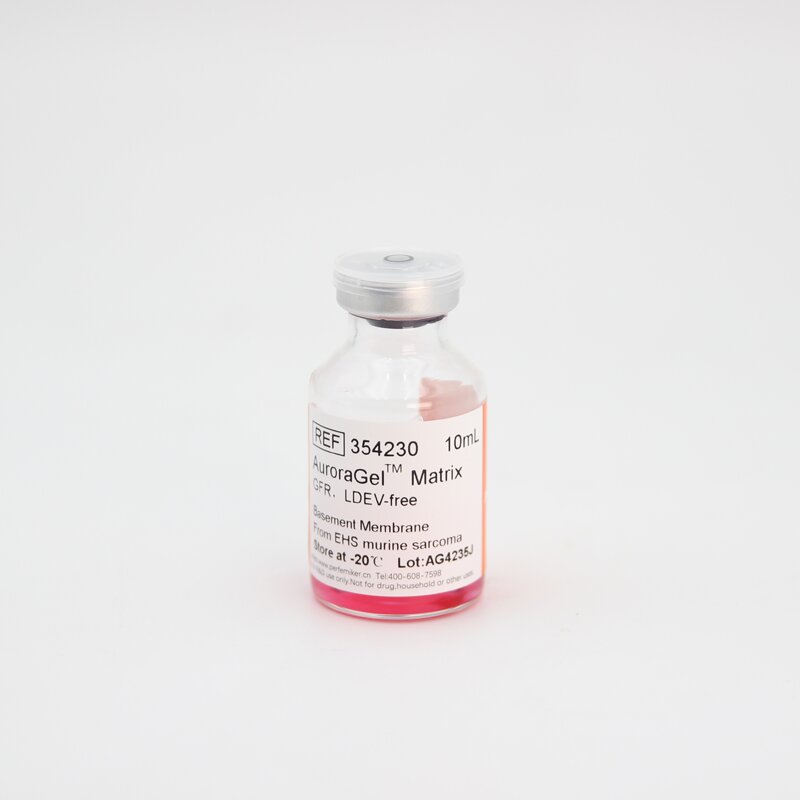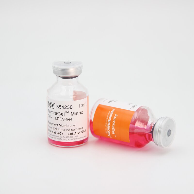 PERFEMIKER® AuroraGelTM Matrix GFR是從富含胞外基質(zhì)蛋白的小鼠腫瘤中提取出的天然基底膜基質(zhì)。主要依次為層粘連蛋白(Laminin)、IV型膠原蛋白(Col-IV)、巢蛋白(Entactin)、硫酸乙酰肝素蛋白多糖(Heparan sulphate proteoglycans)及多種細胞因子,如類胰島素生長因子(IGF-1)、轉(zhuǎn)化生長因子β(TGF-β)、血管內(nèi)皮生長因子(VEGF)、表皮生長因子(EGF)、成纖維細胞生長因子(bFGF)等。產(chǎn)品溶解于高糖含酚紅DMEM中,且非定制產(chǎn)品均添加了50μg/mL慶大霉素。在室溫條件下,聚合形成具有生物學(xué)活性的三維基質(zhì),模擬體內(nèi)細胞基底膜的結(jié)構(gòu)、組成、物理特性和功能,有利于體外細胞的培養(yǎng)和分化。適用于需要減少生長因子誘導(dǎo)的背景信號,對基底膜制備要求較高的研究應(yīng)用。