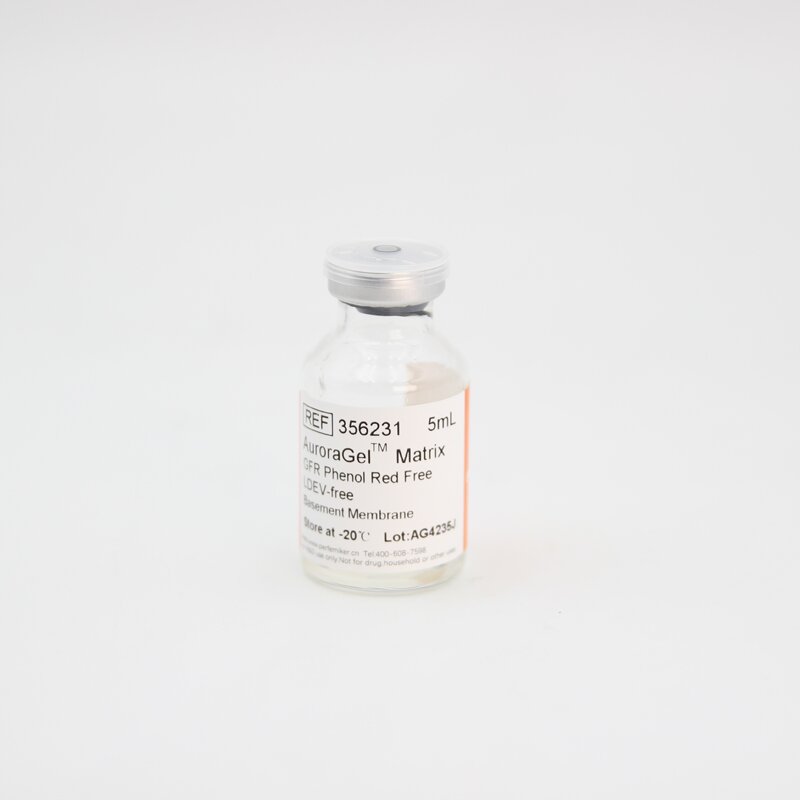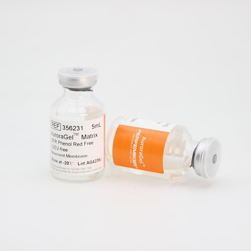 PERFEMIKER® AuroraGel™ Matrix(GFR Phenol Red Free)是從富含胞外基質(zhì)蛋白的小鼠腫瘤中提取出的天然基底膜基質(zhì)。主要依次為層粘連蛋白(Laminin)、IV型膠原蛋白(Col-IV)、巢蛋白(Entactin)、硫酸乙酰肝素蛋白多糖(Heparan sulphate proteoglycans)及多種細胞因子,如類胰島素生長因子(IGF-1)、轉(zhuǎn)化生長因子β(TGF-β)、血管內(nèi)皮生長因子(VEGF)、表皮生長因子(EGF)、成纖維細胞生長因子(bFGF)等。產(chǎn)品溶解于高糖含酚紅DMEM中,且非定制產(chǎn)品均添加了50μg/mL慶大霉素。在室溫條件下,聚合形成具有生物學(xué)活性的三維基質(zhì),模擬體內(nèi)細胞基底膜的結(jié)構(gòu)、組成、物理特性和功能,有利于體外細胞的培養(yǎng)和分化。適用于對基底膜要求較高的研究,如類器官培養(yǎng)、體外血管生成、管狀骨細胞的信號優(yōu)化研究等。