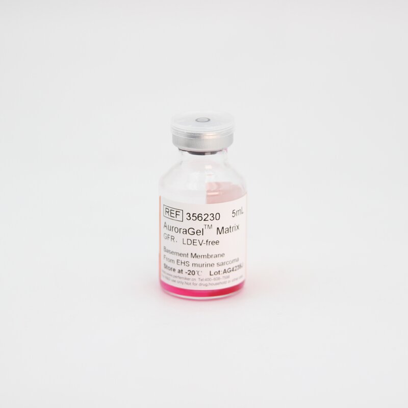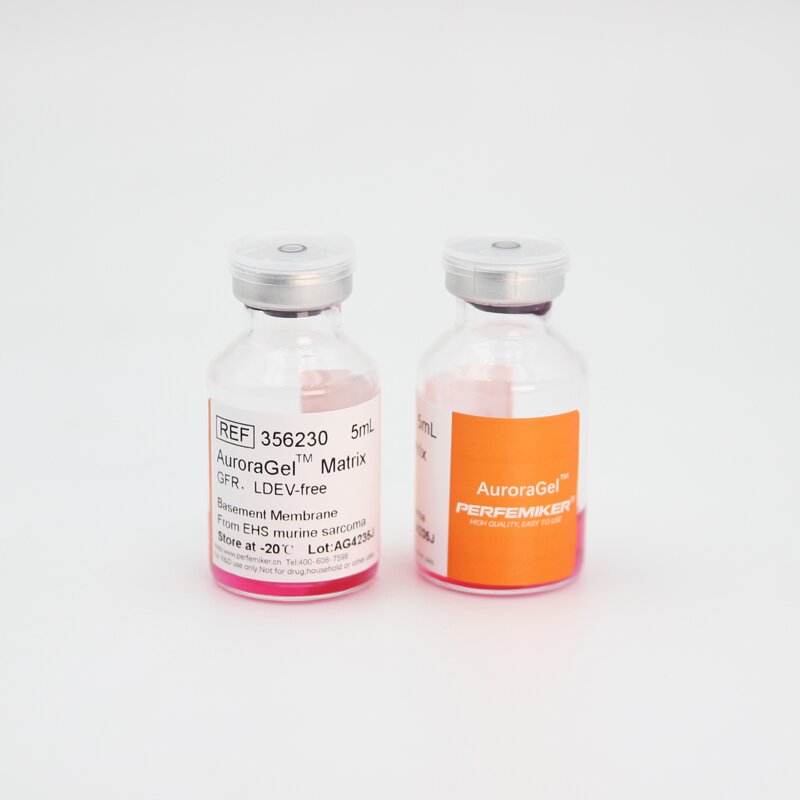 PERFEMIKER® AuroraGelTM Matrix GFR是從富含胞外基質(zhì)蛋白的小鼠腫瘤中提取出的天然基底膜基質(zhì)。主要依次為層粘連蛋白(Laminin)、IV型膠原蛋白(Col-IV)、巢蛋白(Entactin)、硫酸乙酰肝素蛋白多糖(Heparan sulphate proteoglycans)及多種細(xì)胞因子,如類胰島素生長因子(IGF-1)、轉(zhuǎn)化生長因子β(TGF-β)、血管內(nèi)皮生長因子(VEGF)、表皮生長因子(EGF)、成纖維細(xì)胞生長因子(bFGF)等。產(chǎn)品溶解于高糖含酚紅DMEM中,且非定制產(chǎn)品均添加了50μg/mL慶大霉素。在室溫條件下,聚合形成具有生物學(xué)活性的三維基質(zhì),模擬體內(nèi)細(xì)胞基底膜的結(jié)構(gòu)、組成、物理特性和功能,有利于體外細(xì)胞的培養(yǎng)和分化。適用于需要減少生長因子誘導(dǎo)的背景信號,對基底膜制備要求較高的研究應(yīng)用。
