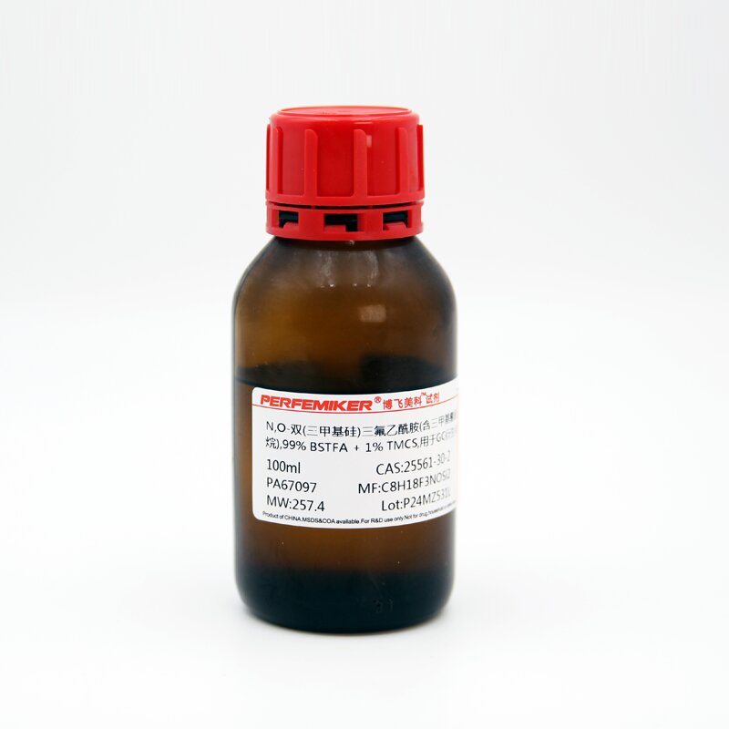 博飛美科的N,O-雙(三甲基硅)三氟乙酰胺(含三甲基氯硅烷),99% BSTFA + 1% TMCS,用于GC衍生化為衍生化試劑,產(chǎn)品穩(wěn)定,定制速度快,極大地方便了廣大科研客戶的使用需求。產(chǎn)品包裝為500ml。查詢關(guān)鍵詞:衍生化試劑,25561-30-2,N,O-雙(三甲基硅)三氟乙酰胺(含三甲基氯硅烷),99% BSTFA + 1% TMCS,用于GC衍生化,N,O-Bis(trimethylsilyl)trifluoroacetamide with trimethylchlo |